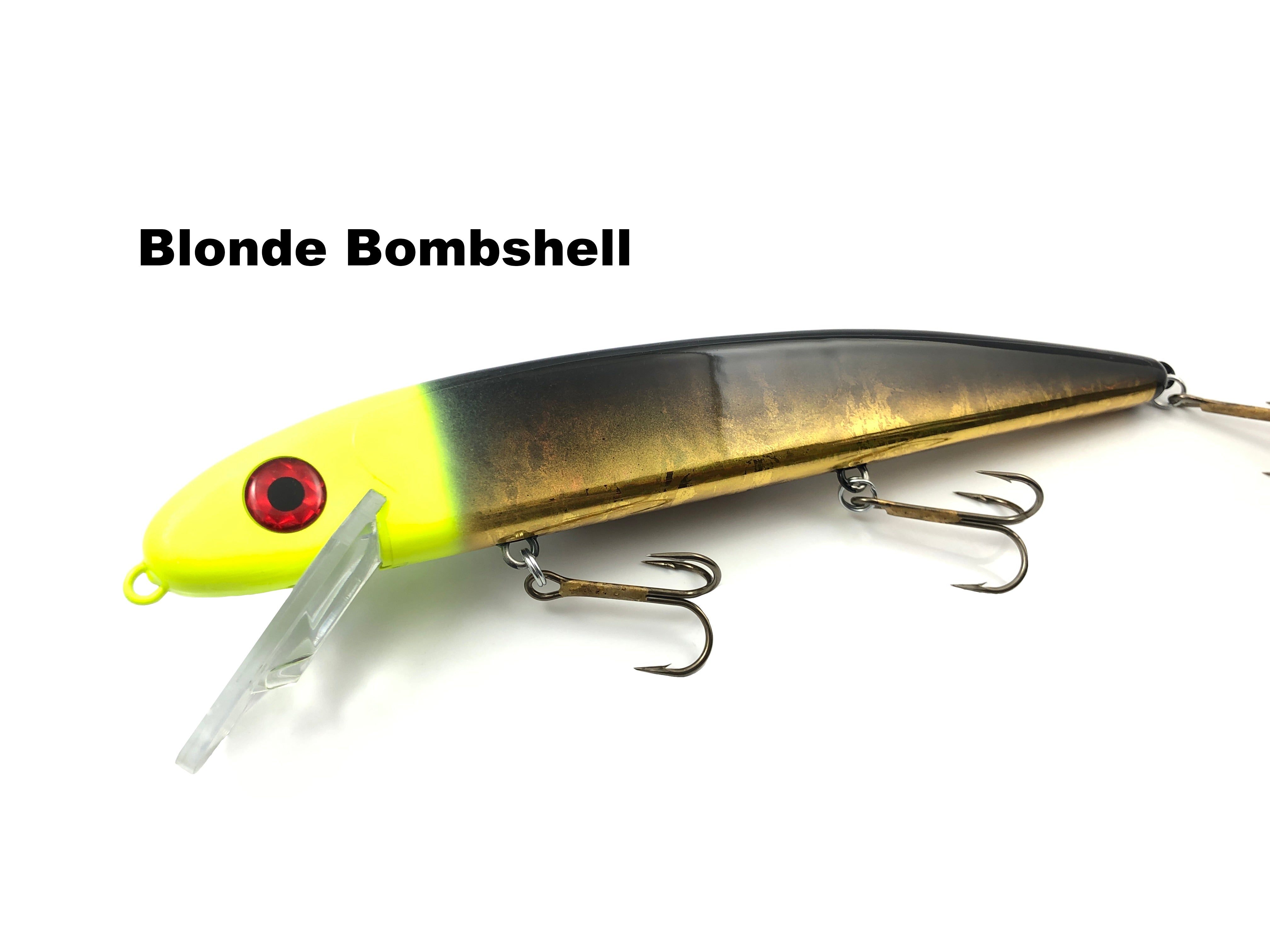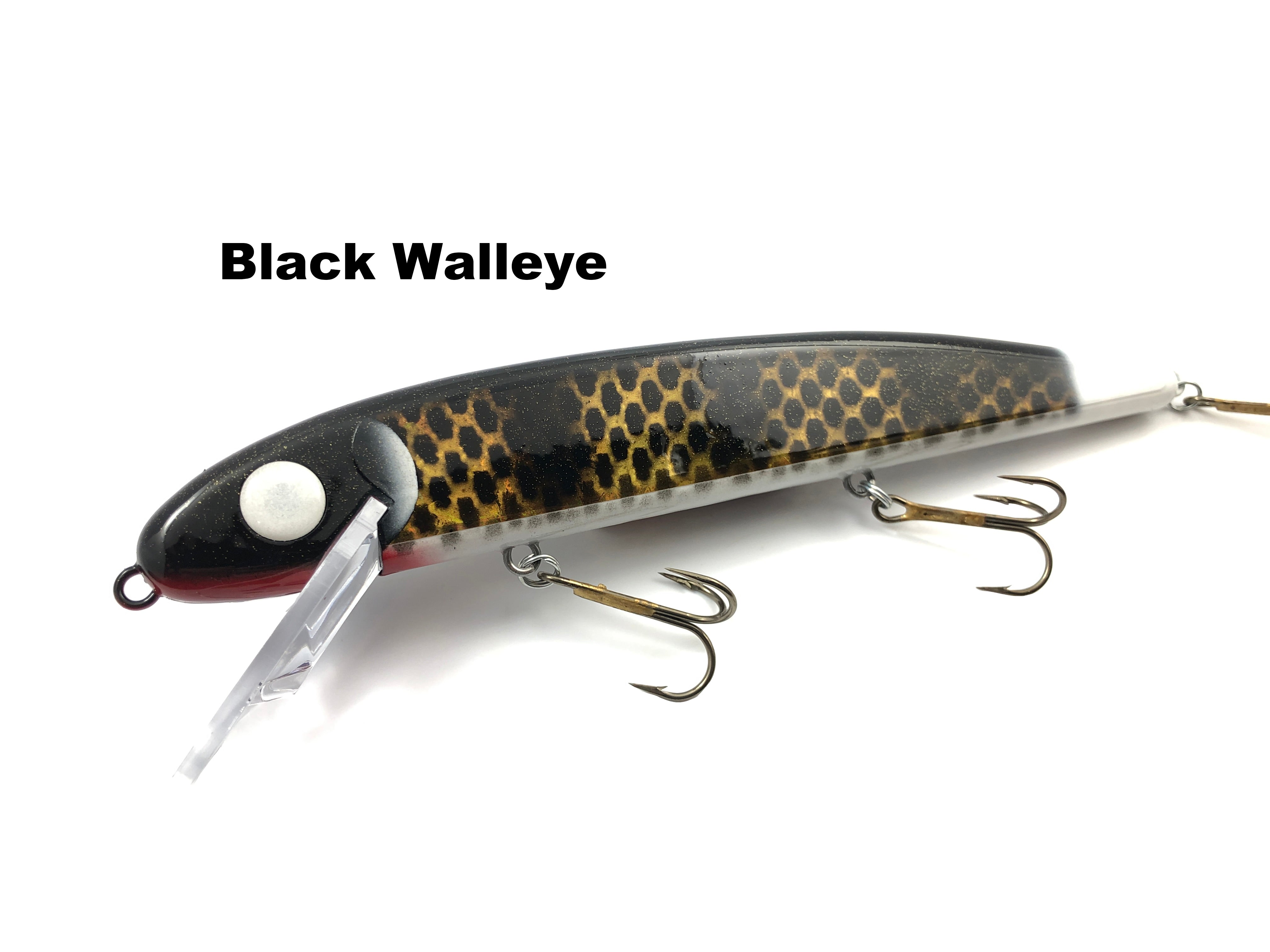 The 10" Jake is an amazing minnow bait that big muskies and northerns just can't resist. A great trolling and casting bait from Late Summer trough the Fall until ice up. One of the most popular techniques is to troll a 10" Jake over hard bottom structure during the late Fall feeding frenzy. It weighs 4.2 oz and will cast 2' to 12' and troll 4' to 20'. When a large profile bait is needed don't overlook this Giant Musky Super Star. The Jake has a rattle for added attraction. The 10" Jake musky lure is available in exclusive TRO colors.