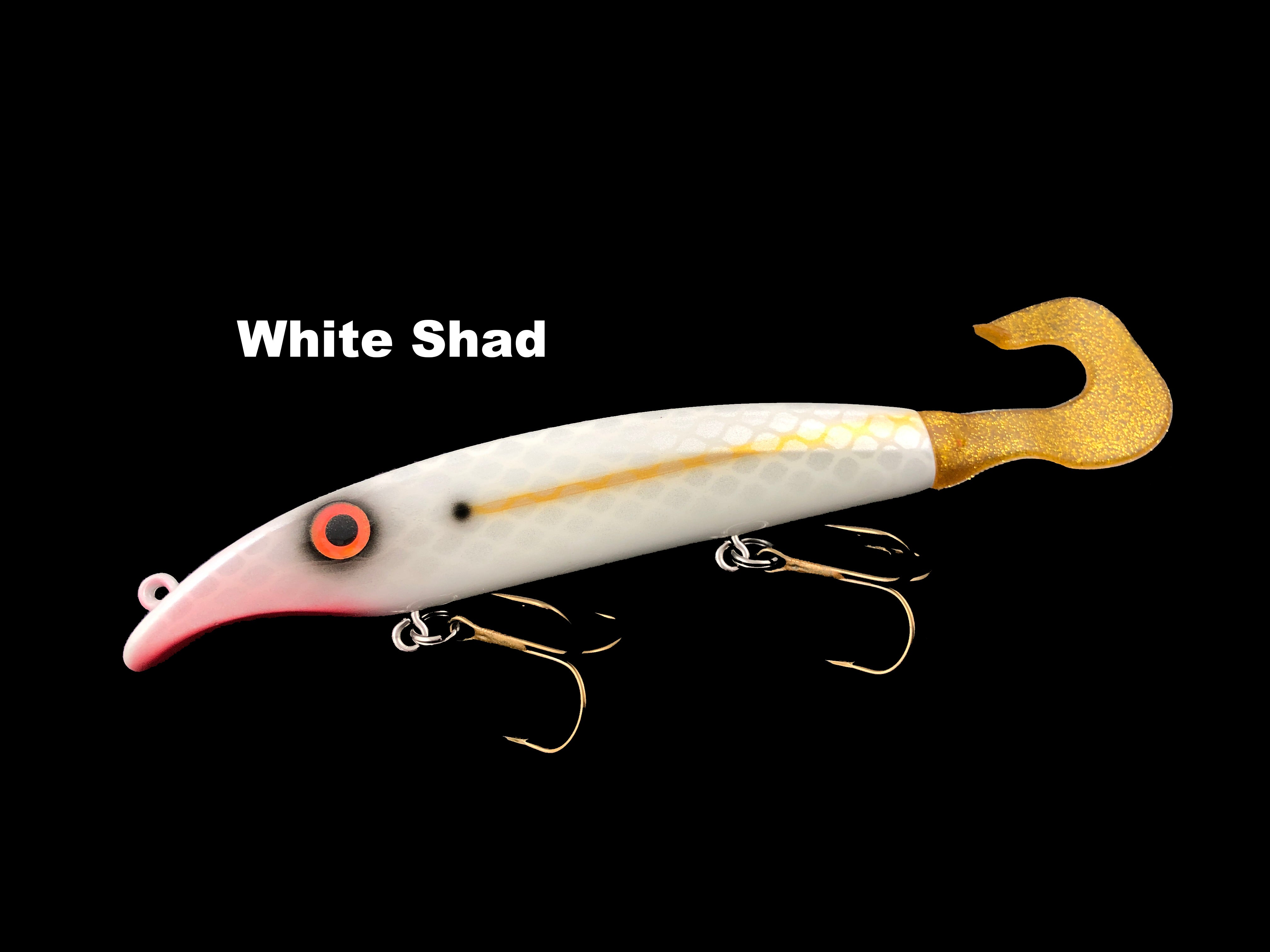 The Raptor from Fat AZ Musky products is a dive and rise deep diving jerk bait with near neutral buoyancy. If you work deep weed edges, timber, or any deeper structure this is a must have. The soft tail has the same great action of the original with the added attraction of the grub tail. The 8" soft tail is 7 1/4" long (hard body), 11 3/4" with the tail, 1 1/8" across the back, and weighs 4.2 oz. Watch the video to see the Raptor in action. The Raptor musky lure is available in many TRO exclusive custom colors.