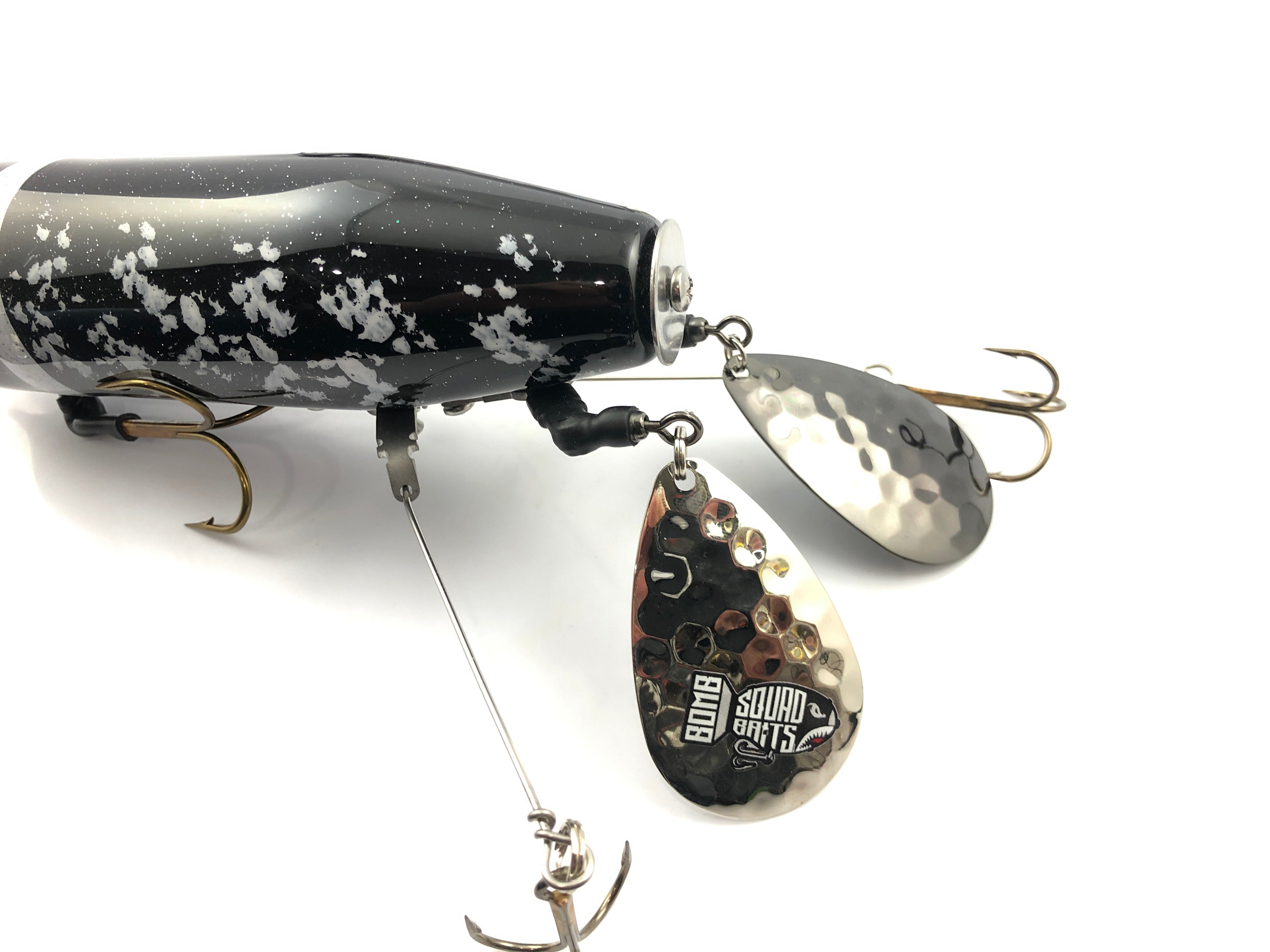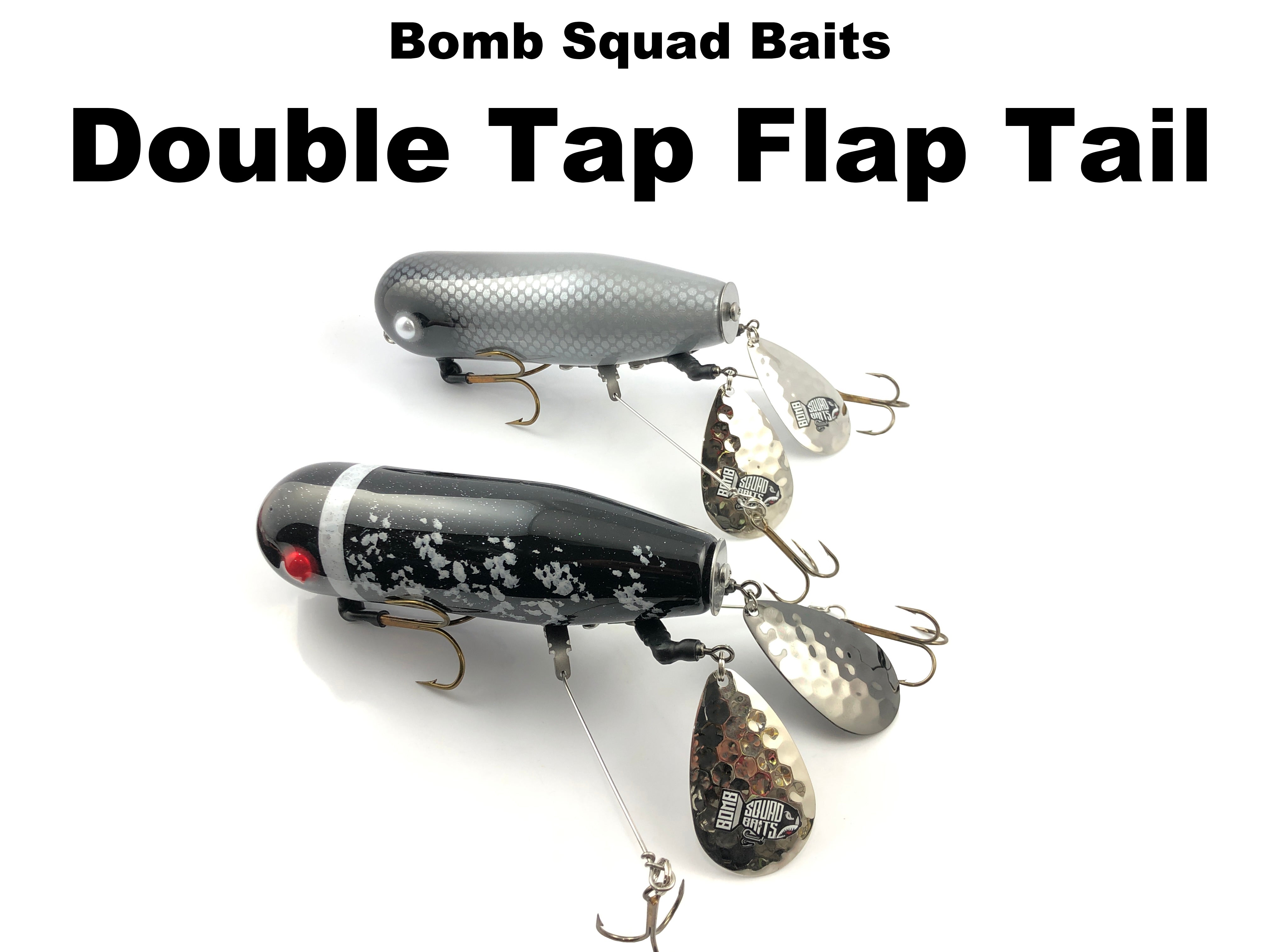New and very limited for 2026 is the Double Tap Flap from Bomb Squad Baits. If you are familiar with the MK65 Series from Bomb Squad than this will be a familiar musky lure. It's built from hand in the US from the highest quality products. Its large profile generates a wake and now with 2 blades causing a ruckus in the back it's sure to draw lots of attention. The Double Tap Flap weighs 7 oz and the wood body is 7" long.